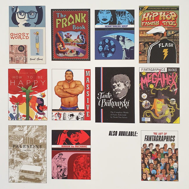 De collectie omvat iconische covers door o.a. Daniel Clowes' Ghost World (verfilmd in 2001 met Scarlett Johansson in de hoofdrol), Joe Sacco's met de American Book Award bekroonde ‘Palestine’, de New York Times-bestseller ‘My Favorite Thing is Monsters’, Simon Hanselmans bejubelde Megg and Mogg-serie, Love and Rockets van de Hernandez Brothers, en vele andere.