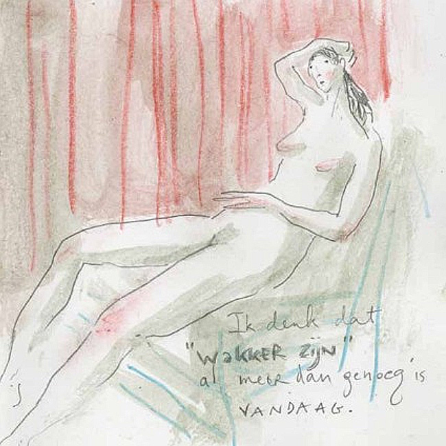 'Woensdagnacht, 3.45u, ik pieker. Angstaanval. Alweer. Alles schreeuwt, giert, schuurt. De huid rond mijn schedel lijkt zich vacuüm te trekken. Snijdende pijn. Alles voelt eng, nauw. Geen ruimte, geen adem. Een tijd geleden bliksemde en donderde het in het hoofd van Sabien Clement. De lat die jaar na jaar hoger en hoger werd gelegd, en haar willen, doen en kunnen waaraan getrokken en getrokken werd, zorgden ervoor dat het touwtje knapte en het lijf leegliep. Alleen modeltekenen lukte nog. Dat wel. Gelukkig.'